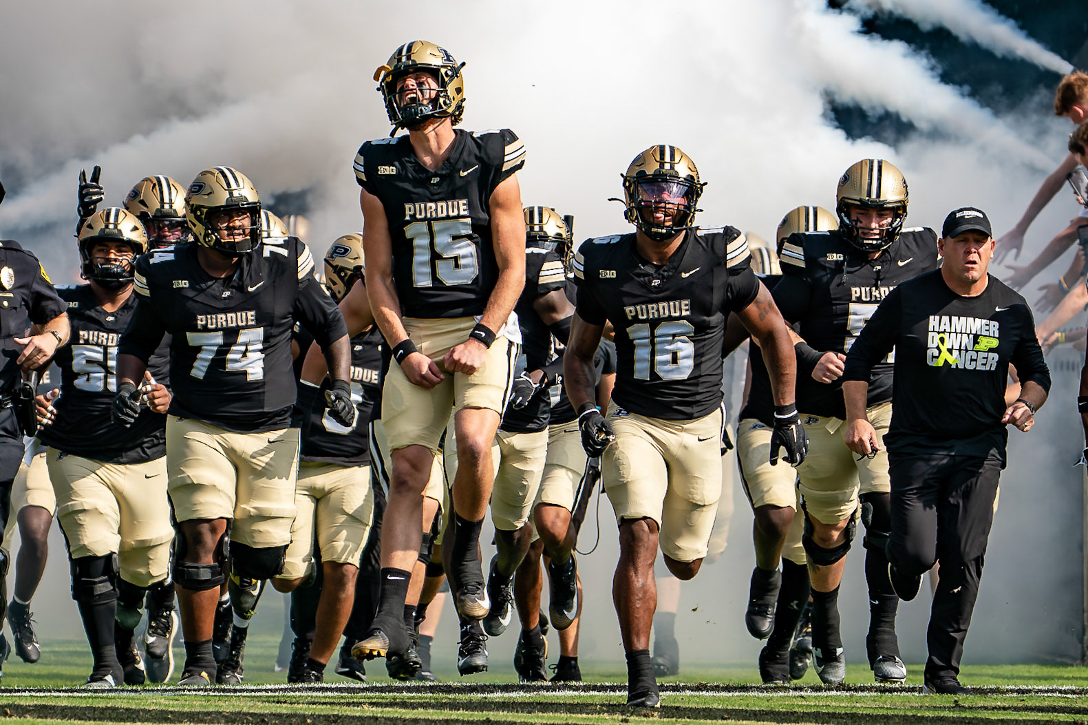 WEST LAFAYETTE, IN - OCTOBER 4, 2025: Purdue University Sophomore Quarterback Ryan Browne (15) shows his excitement as Head Coach Barry Odom, Senior Linebacker Mani Powell (16), and Senior Offensive Lineman Jalen St. John (74) come out of the tunnel just before the Purdue Boilermaker Football vs University of Illinois Fighting Illini at Ross-Ade Stadium